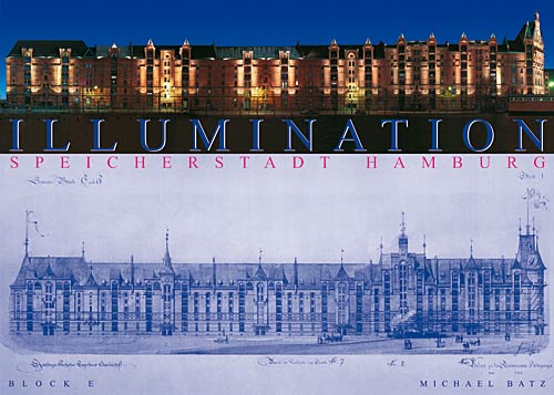 „Illumination der Speicherstadt“ Die Panoramaaufnahme der illuminierten Speicherstadt im eindrucksvollen Kontext zu der historischen Architekturzeichnung von Block E aus dem Jahre 1887.